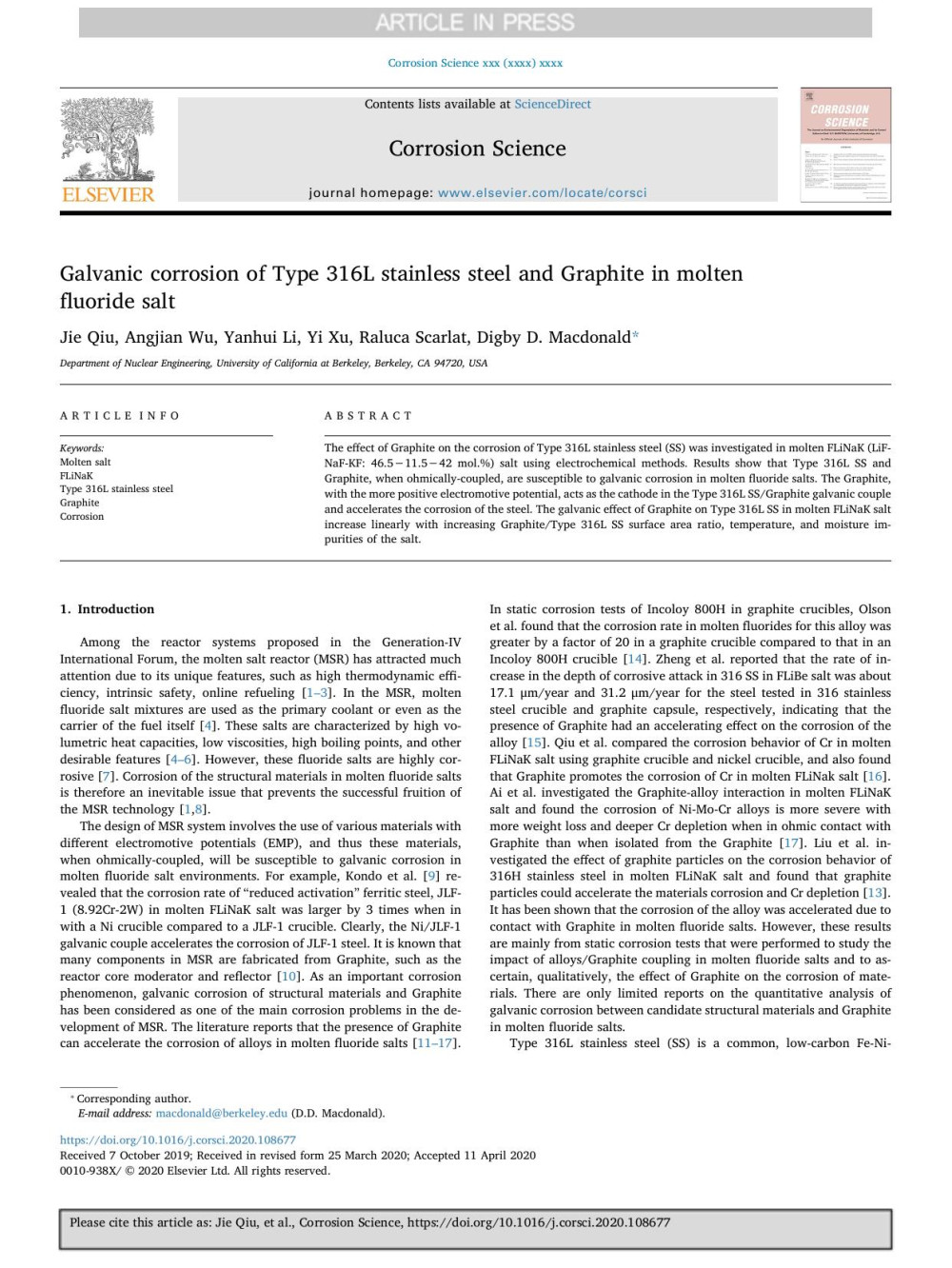 Galvanic corrosion of Type 316L stainless steel and Graphite in molten fluoride salt – eBook PDF